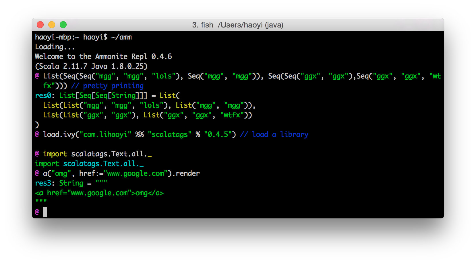A Modernized Scala REPL. With syntax highlighting, multi-line editing, the ability to load maven artifacts directly in the REPL, and many other quality-of-life improvements missing in the default Scala REPL. |