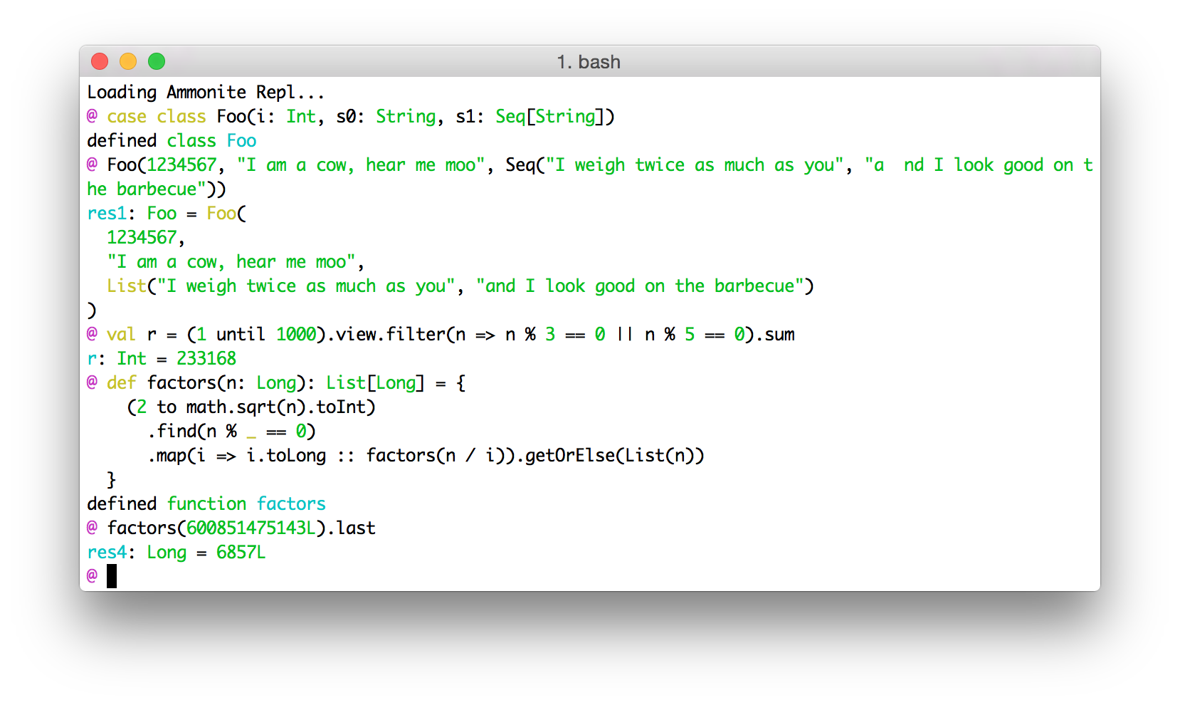 The Ammonite-REPL is an improved Scala REPL, reimplemented from first principles. It is much more featureful than the default REPL and comes with a lot of ergonomic improvements and configurability that may be familiar to people coming from IDEs or other REPLs such as IPython or Zsh.